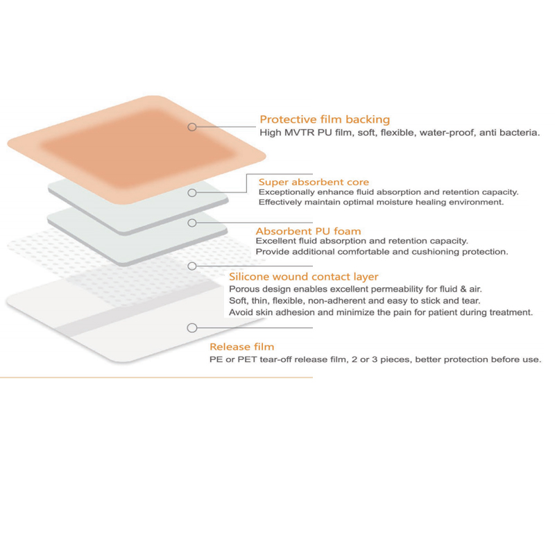 Borderový silikonový pěnový obvaz je samolepicí obvaz s dodatečným ohraničeným okrajem sestávajícím z ochranného flm podkladu, superabsorpčního jádra, absorpční PU pěny, silikonové kontaktní vrstvy na rány a uvolňovací fólie.