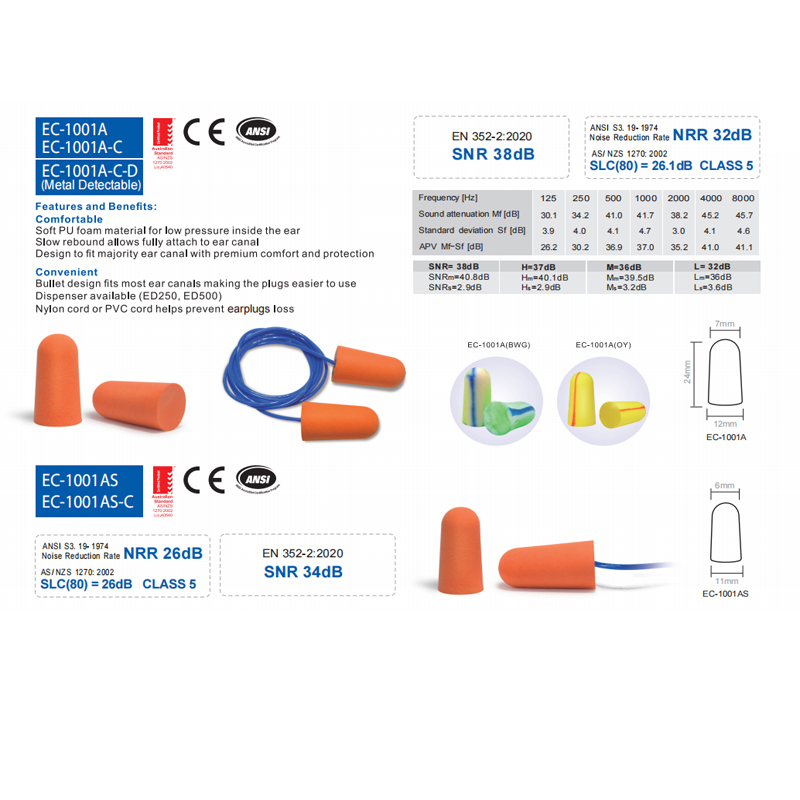 Design kulky pro většinu zvukovodů usnadňující použití ucpávek Dostupný dávkovač (ED250,ED500)Nylonová šňůra nebo PVC šňůrka pomáhá předcházet ztrátě špuntů do uší