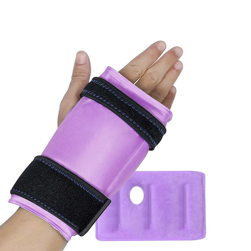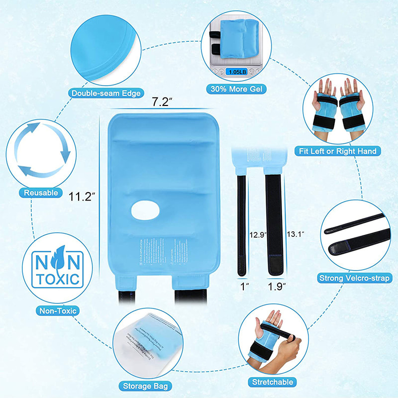 Dlouhé elastické popruhy s lepicím zapínáním jsou přenosné k upevnění zábalu ledu na ruce. Je vhodné aplikovat chladovou terapii s ledovým obkladem bez překážek v pohybu rukou. Když chladíte ledové sáčky pro zranění opakovaně použitelný gel v mrazáku, umístěte ledový sáček do úložného sáčku, abyste ho chránili před skvrnami a zápachem v mrazáku. Úložný vak je také přenosný, abyste si ledový balíček vzali pro outdoorové aktivity.