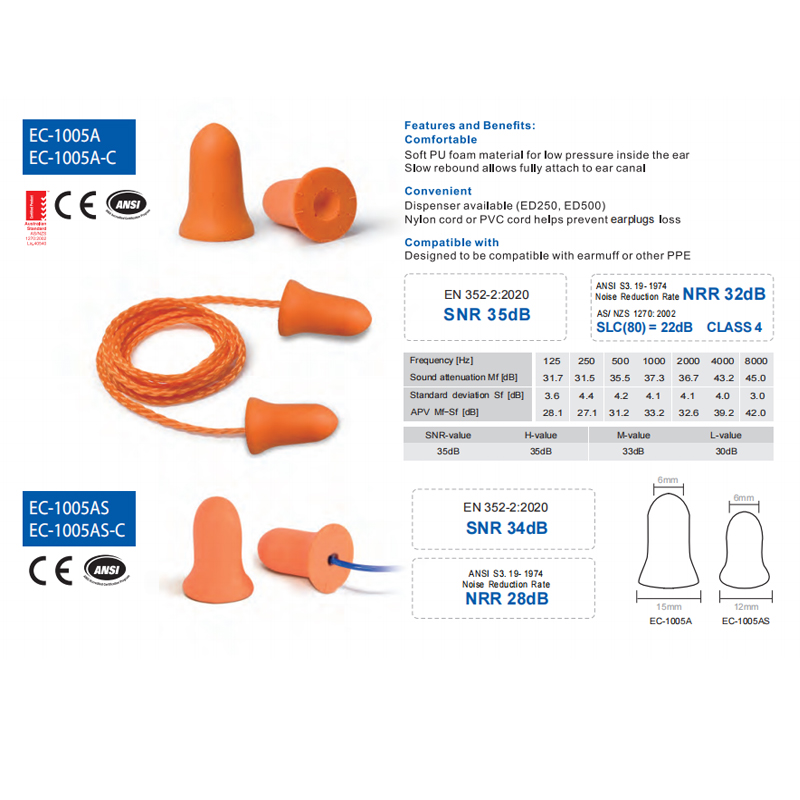 K dispozici dávkovač (ED250, ED500) Nylonový kabel nebo PVC kabel pomáhá předcházet ztrátě špuntů do uší
