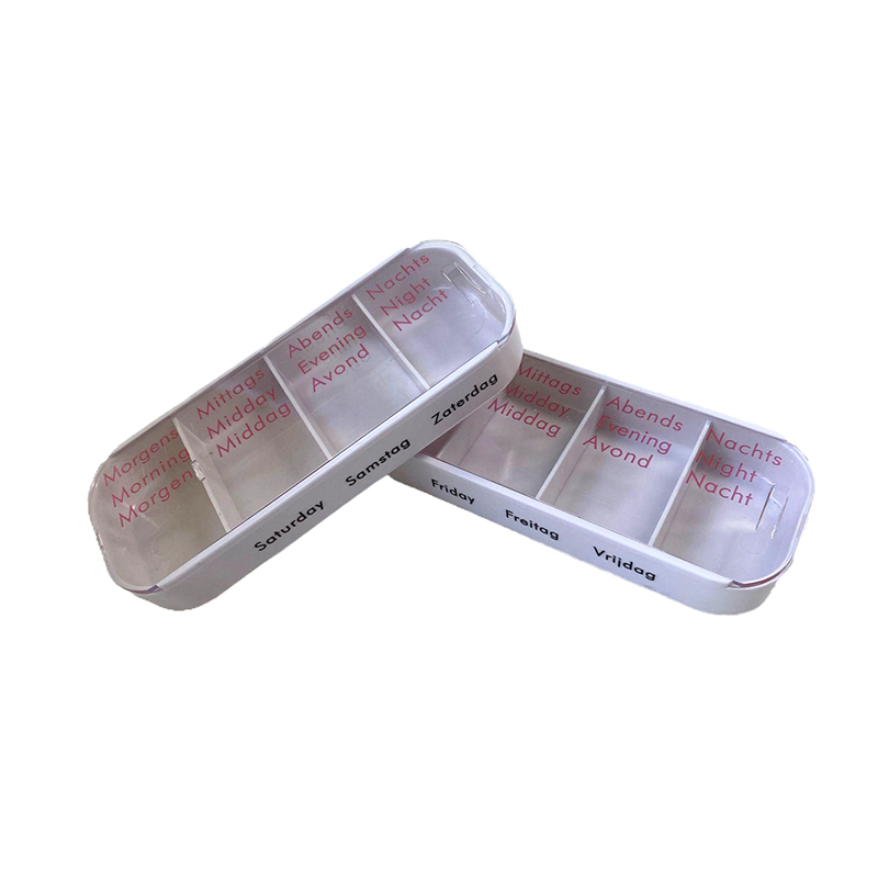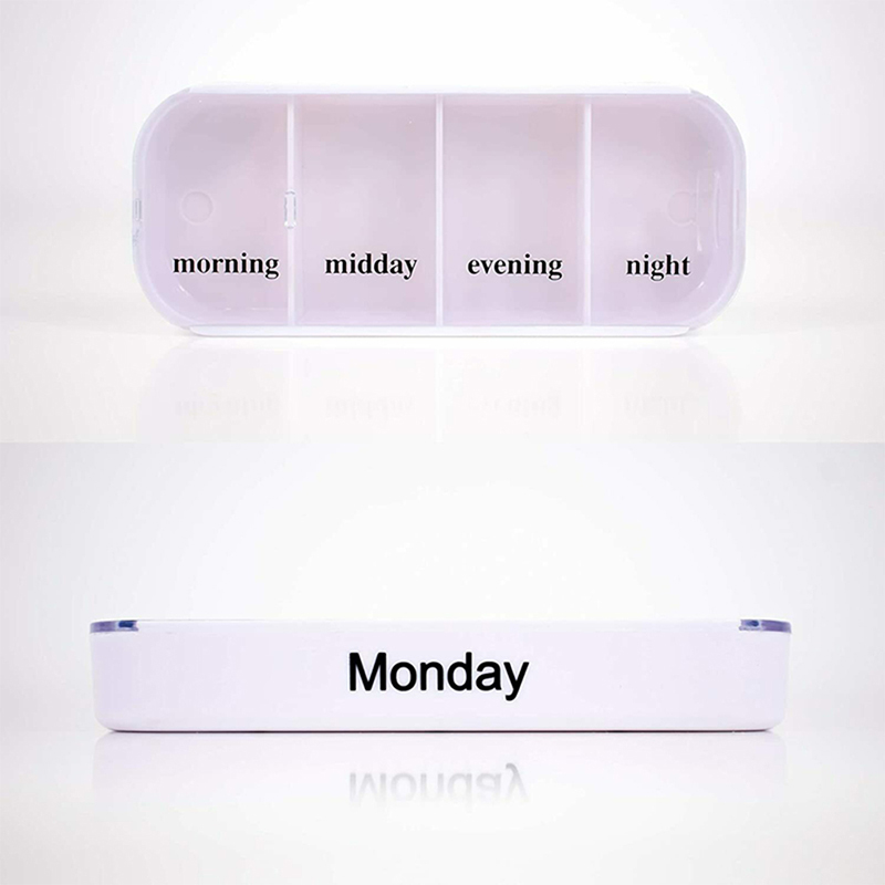 Vnější pouzdro je navrženo jako průhledné a každý zásobník má jedinečnou jasnou barvu, aby uživatel snadno rozlišil dny v týdnu.