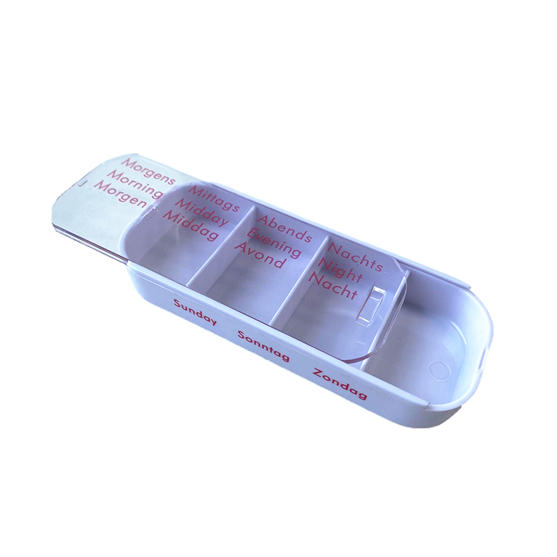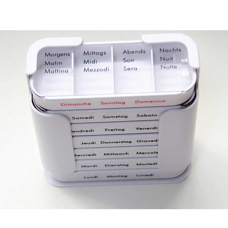 Každý zásobník je určen pro jeden všední den a má čtyři přihrádky s ranním, poledním, večerním a nočním štítkem.