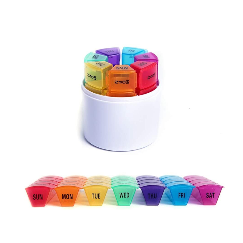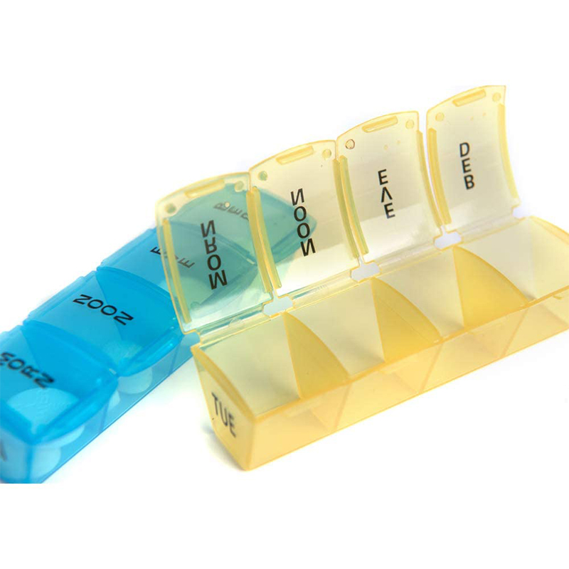 Každá kompaktní krabička na léky je potištěna ikonami data a času týdne a každou týdenní krabičku na pilulky lze snadno odlišit 7 různými barvami.