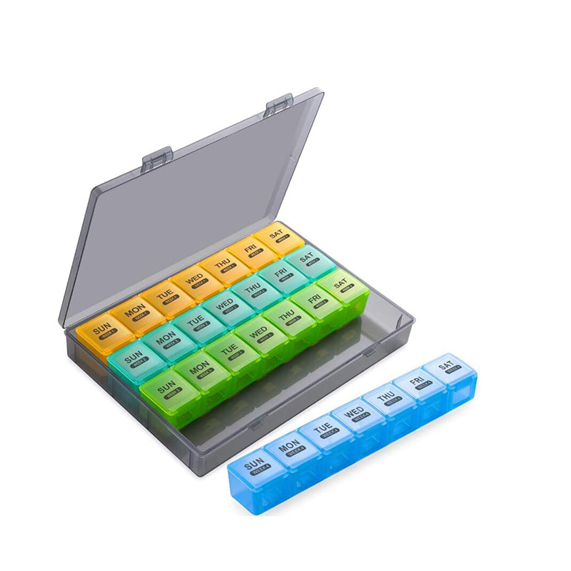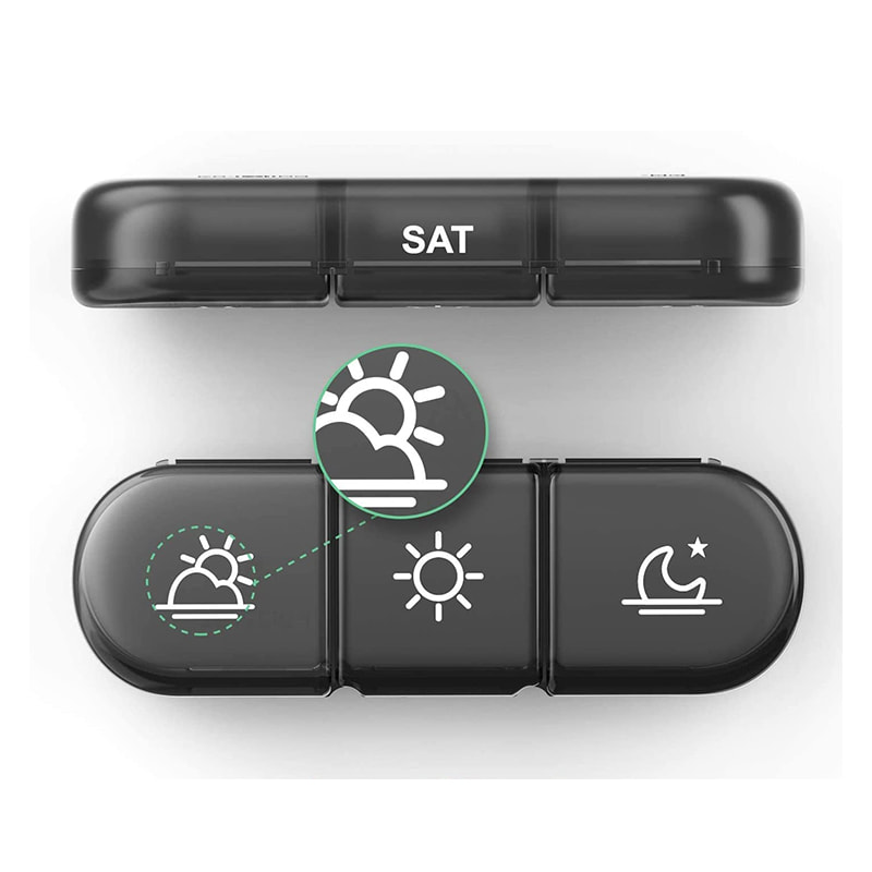 Denní krabičky na prášky jsou vyrobeny z potravinářského PP plastu, zatímco vnější obal je vyroben z ABS plastu, neobsahuje BPA a je bezpečný pro lékařské použití.