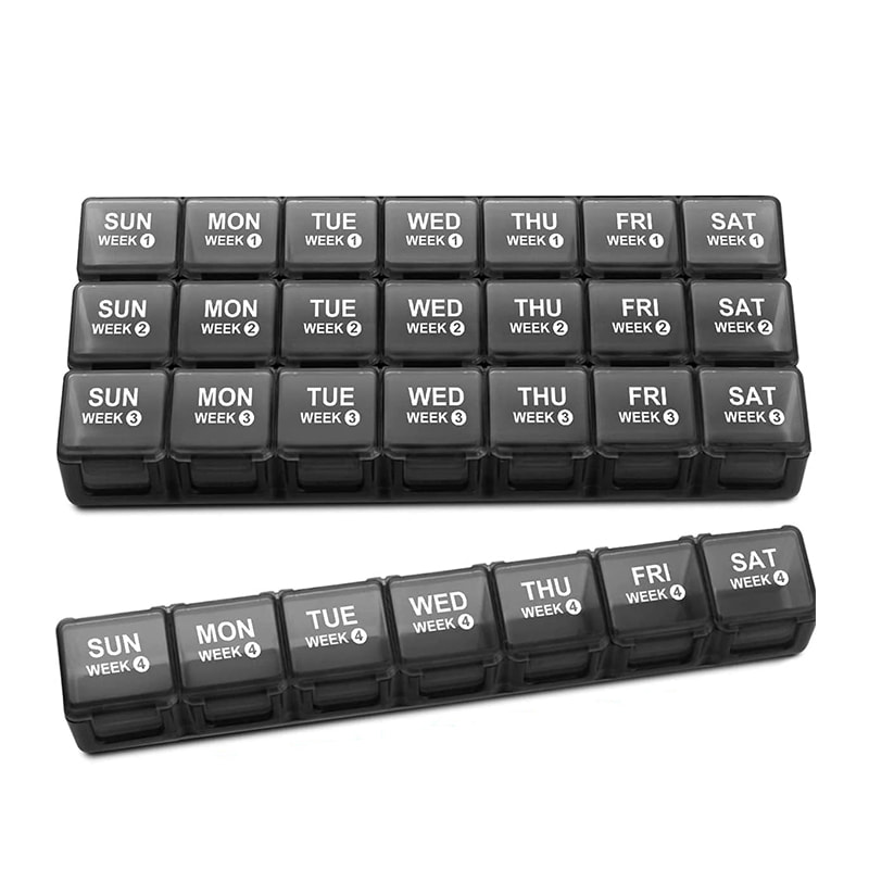Naše krabička na pilulky má čtyři zásobníky na jeden týden na pilulky, dokáže uspořádat váš měsíční lék a bude na dobré cestě k udržení vašeho lékového režimu AM/PM.