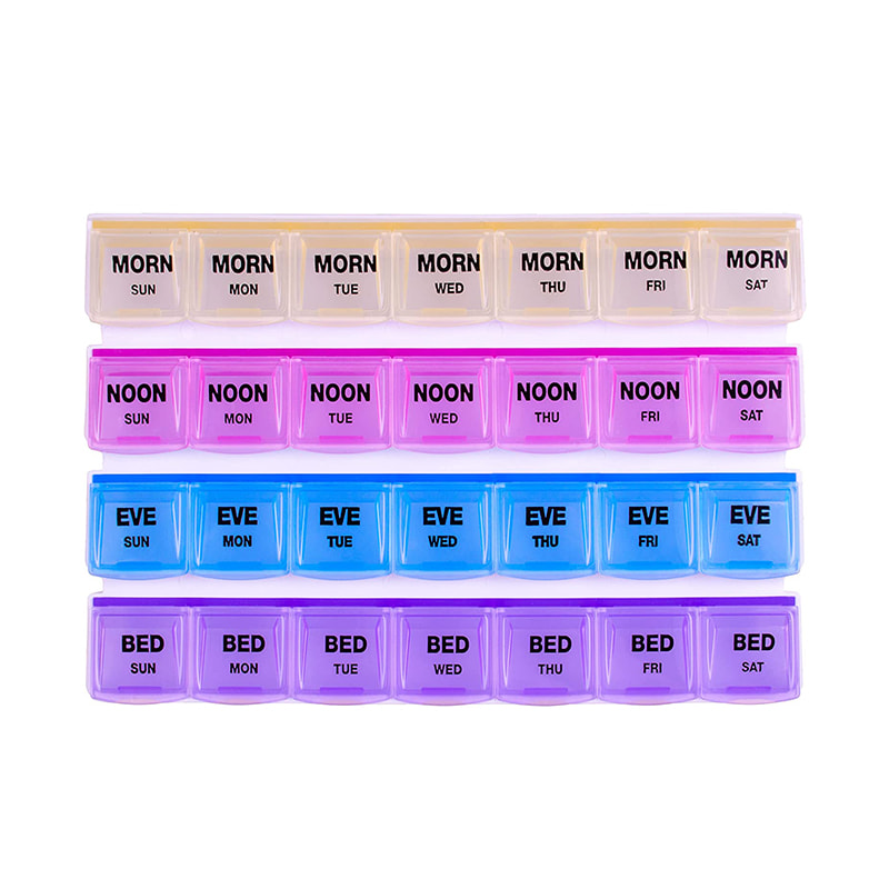 Tato 7denní krabička na pilulky vám umožní organizovat léky na ráno, odpoledne, večer a před spaním. Barevně kódovaná, průhledná a snadno otevíratelná víčka umožňují snadnou kontrolu, zda jste si pilulky uspořádali a vzali správně