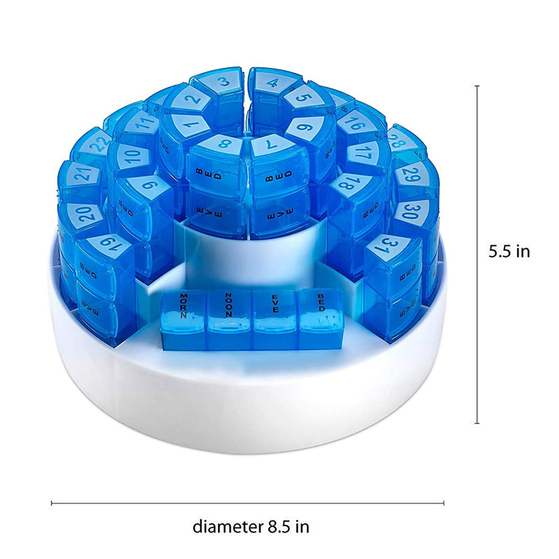 Kruhový design také umožňuje, aby se organizér na pilulky snadno fotil na pracovní desku, a zároveň vám umožňuje vzít si léky každý den s sebou, ať jste kdekoli!