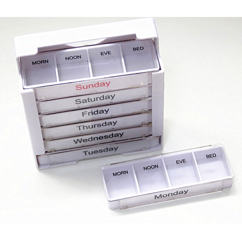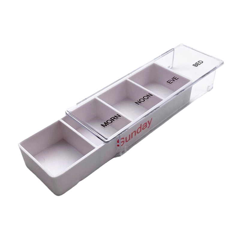 Vnější pouzdro je navrženo jako průhledné a každý zásobník má jedinečnou jasnou barvu, aby uživatel snadno rozlišil dny v týdnu.