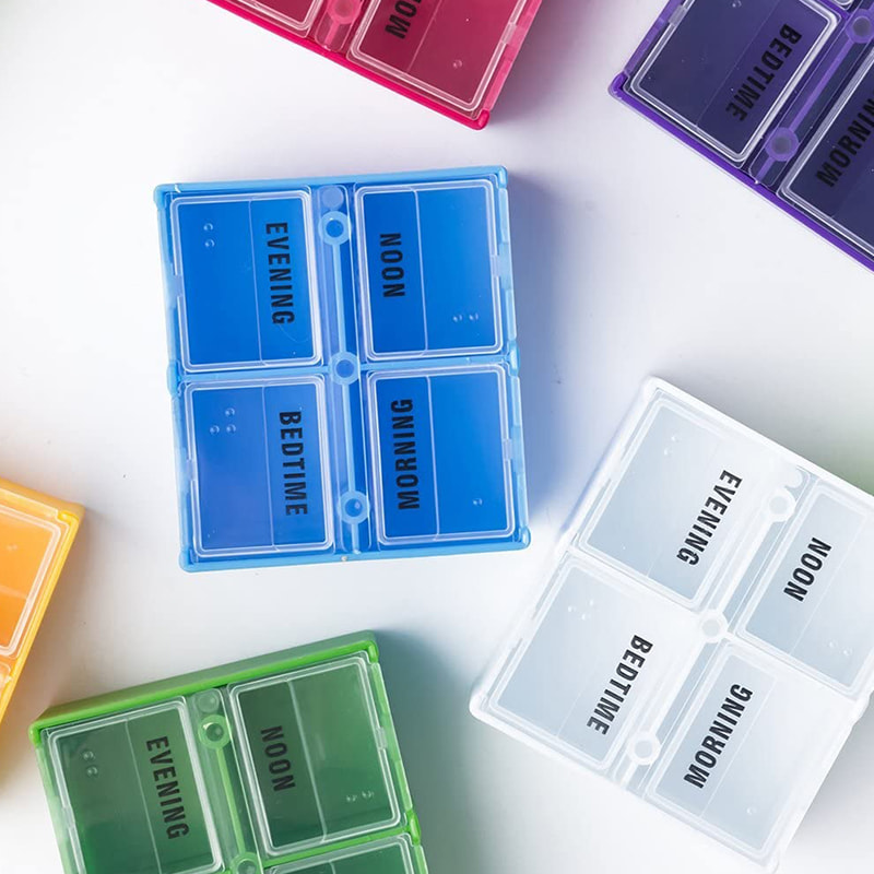Každá přihrádka je oddělena čtyřmi snadno otevíratelnými víčky, takže budete moci pokaždé vědět, kdy si vzít kterou z vašich pilulek!