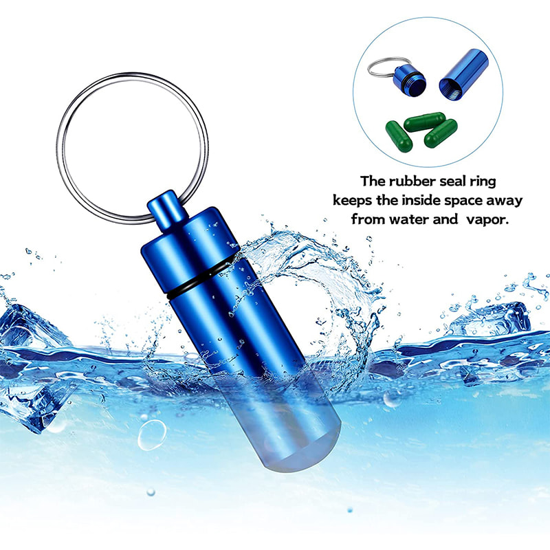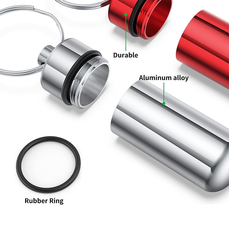 Držák pilulek má na šroubovacím uzávěru gumové těsnění ve tvaru O-kroužku, které je dostatečně vzduchotěsné a vodotěsné, aby udrželo vaše pilulky uvnitř v bezpečí a suchu, když jste na dovolené, výletu, kempování nebo jakékoli venkovní aktivitě.