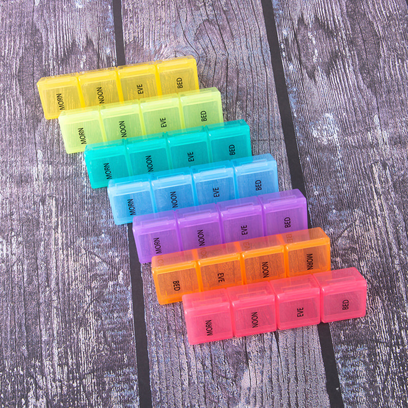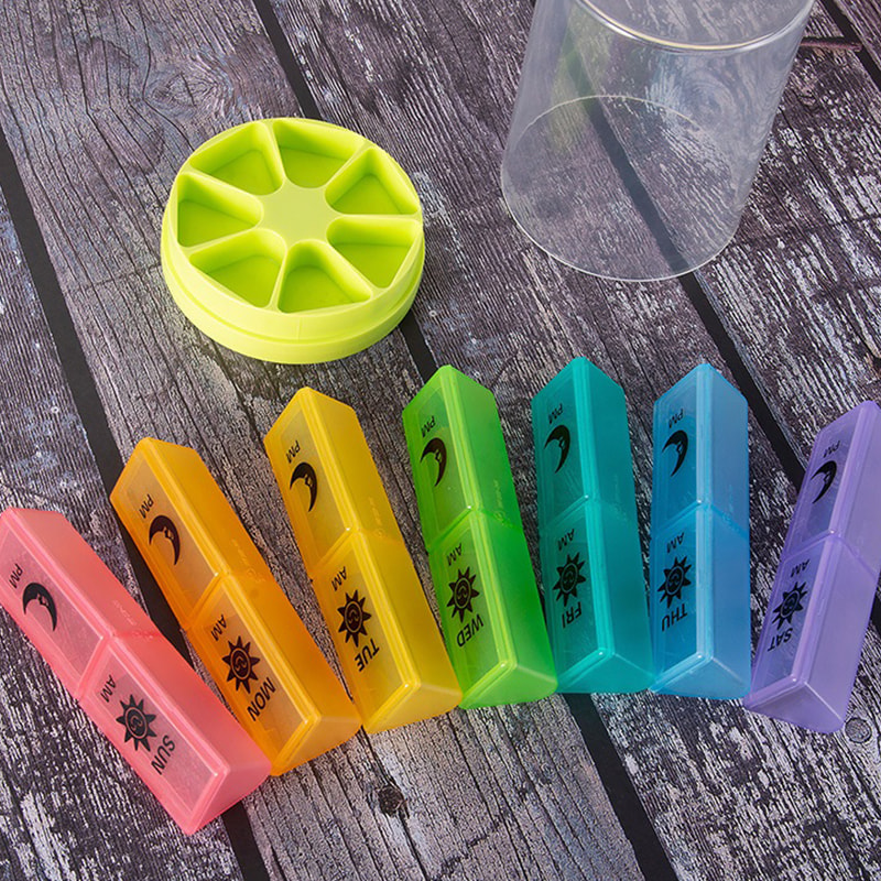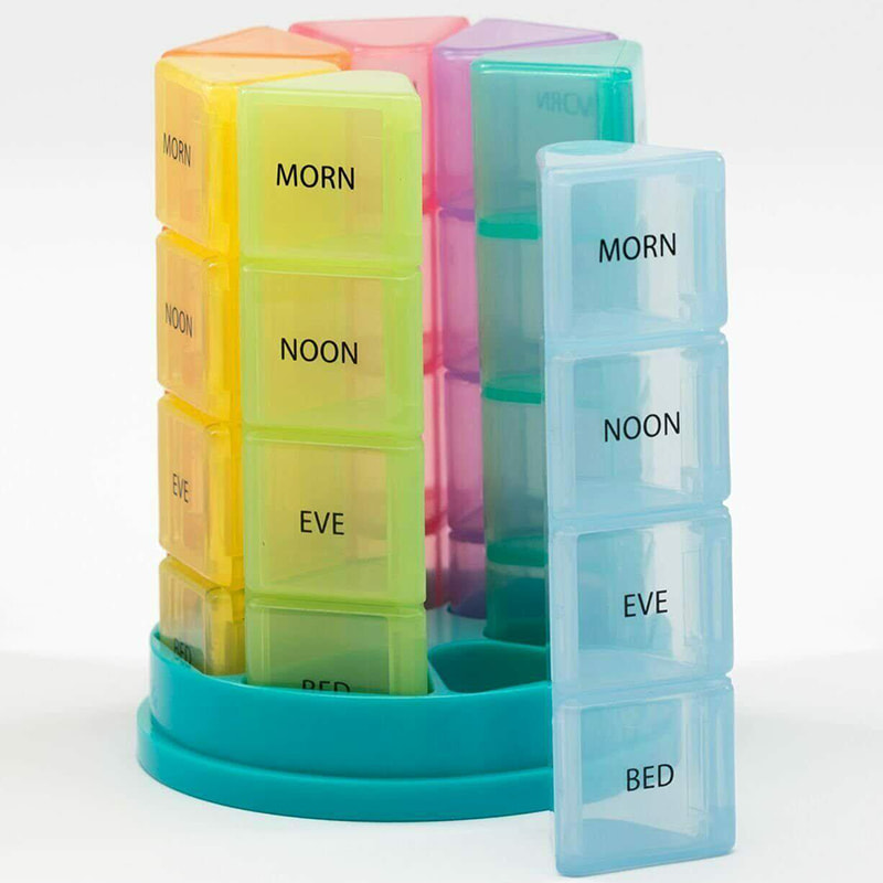 Každá kompaktní krabička na léky je potištěna ikonami data a času týdne a každou týdenní krabičku na pilulky lze snadno odlišit 7 různými barvami.