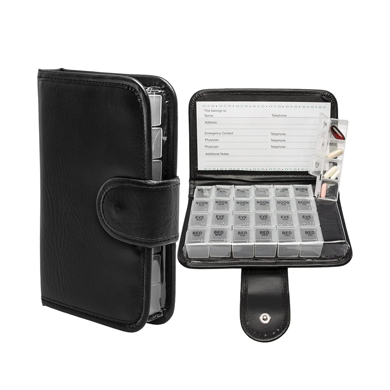 Vnější strana držáku dávkovače pilulek je bavlněná polyesterová tkanina nebo luxusní umělá kůže.