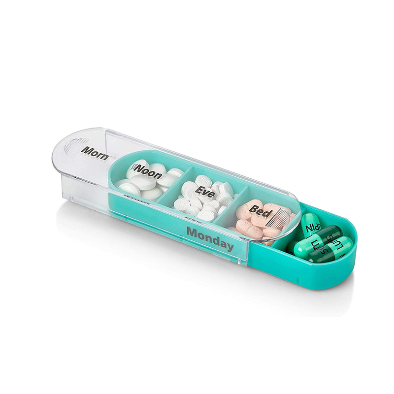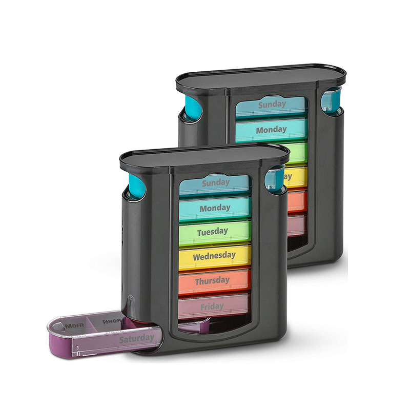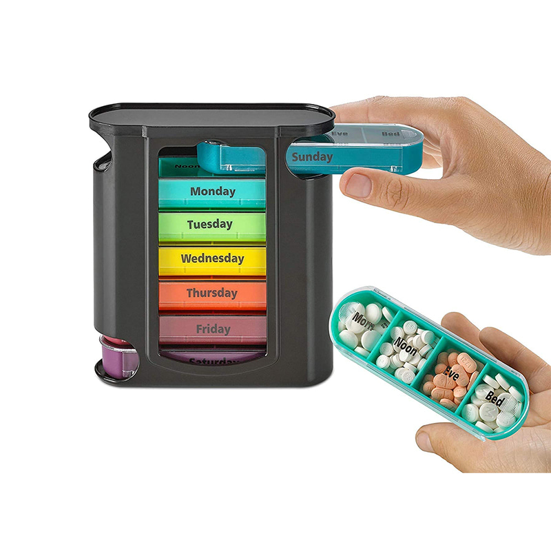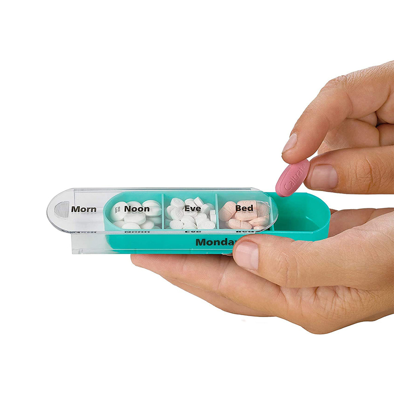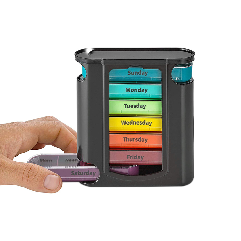 Vnější pouzdro je navrženo jako průhledné a každý zásobník má jedinečnou jasnou barvu, aby uživatel snadno rozlišil dny v týdnu.