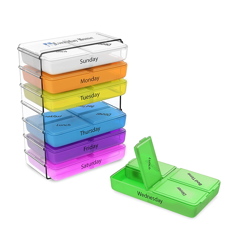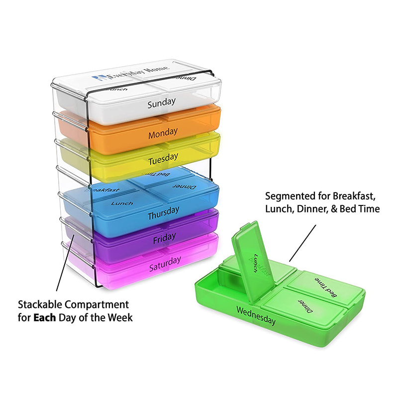 Tento malý stohovatelný denní organizér na pilulky vyžaduje velmi málo místa na pultu.