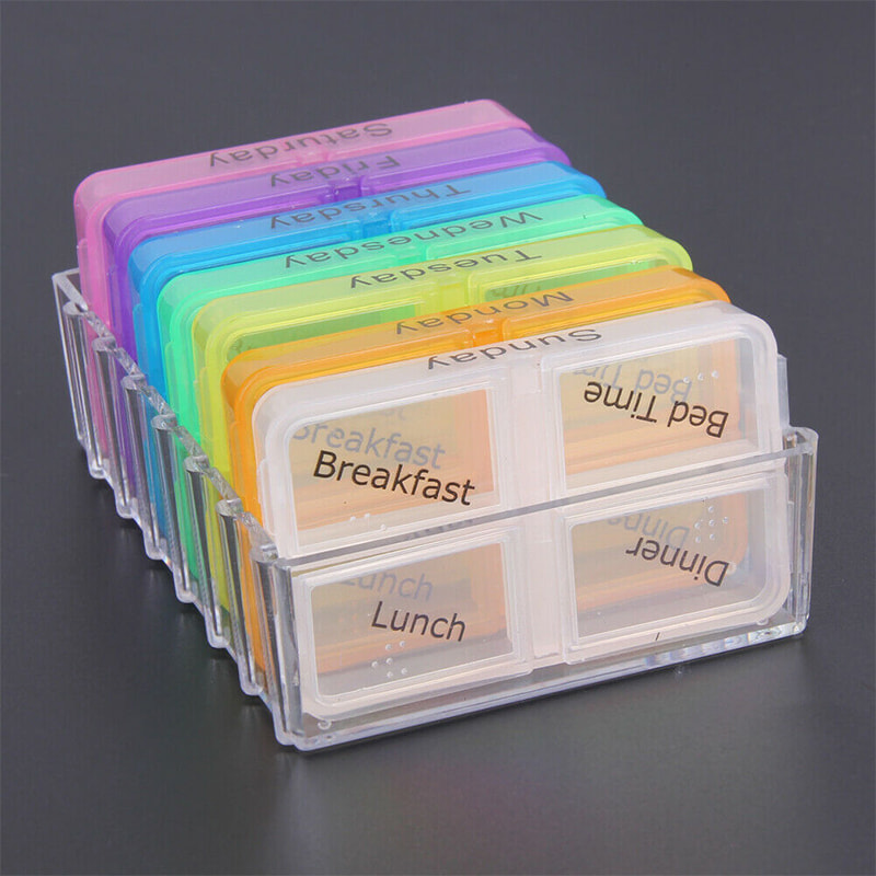 Tato denní nádoba na pilulky má velké, snadno čitelné štítky na každé přihrádce, takže svůj lék vždy najdete bez námahy.