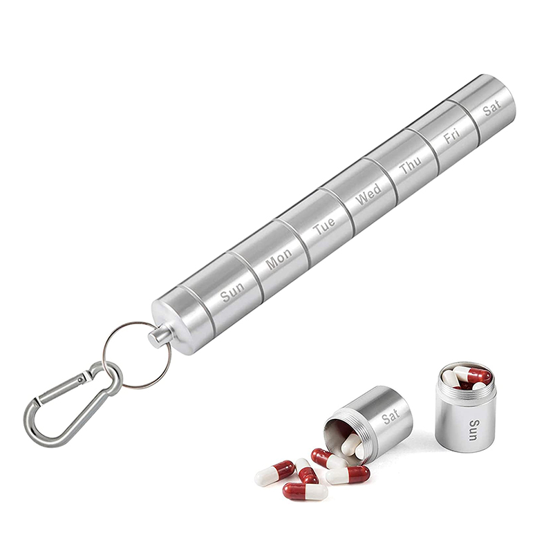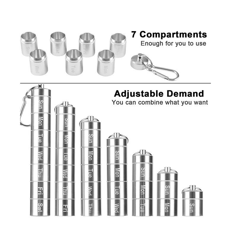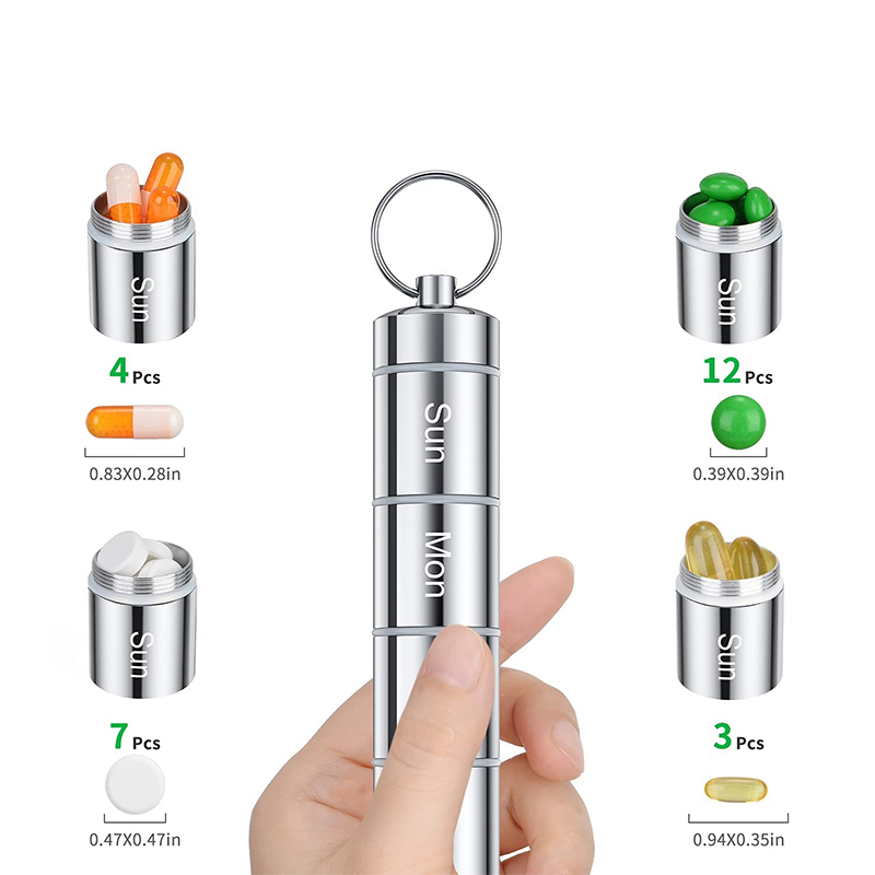 Každý týdenní obal na pilulky má klíčenku a horolezeckou přezku, kterou lze zavěsit na klíčenku nebo tašku, snadno se přenáší, se silikonovým těsnícím kroužkem, jsou odolné proti vlhkosti a voděodolné