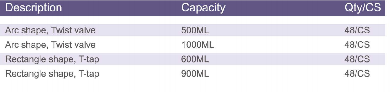 Kapacita dostupná v 350 ml, 500 ml, 600 ml, 750 ml, 800 ml,